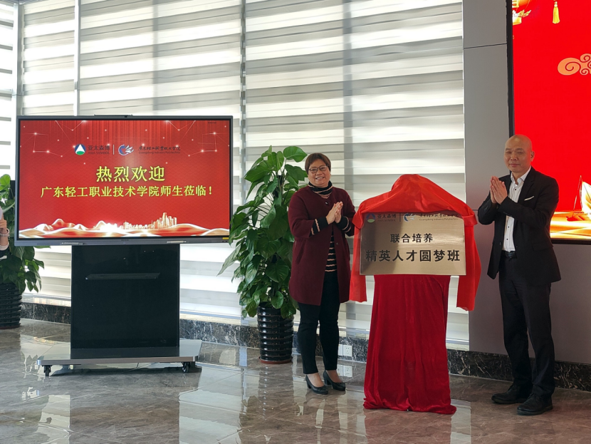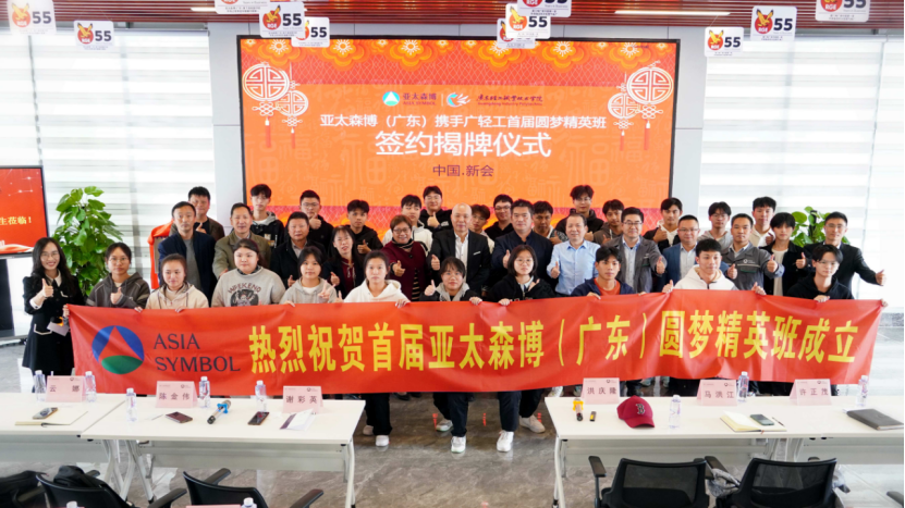 2023年2月17日上午,“亚太-广轻联合培养精英人才圆梦班”签约暨揭牌仪式在亚太森博(广东)纸业有限公司(以下简称亚太森博)隆重举行。广东轻工职业技术学院(以下简称广东轻工)轻化工技术学院党总支书记谢彩英、主持工作副院长陈金伟、副院长云娜、造纸教研室主任王宝玉、教务部揭广川,亚太森博董事总经理洪庆隆、人事行政总监马洪江、运营副总监许正茂、招聘经理常永亮、生产副经理吴锦明、招聘副经理钟开明、邓刚出席了本次仪式。