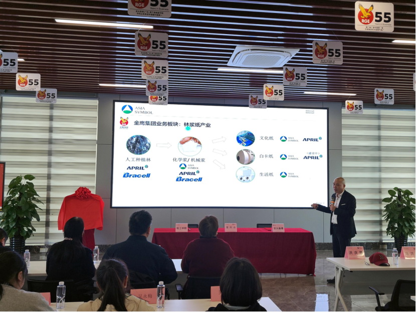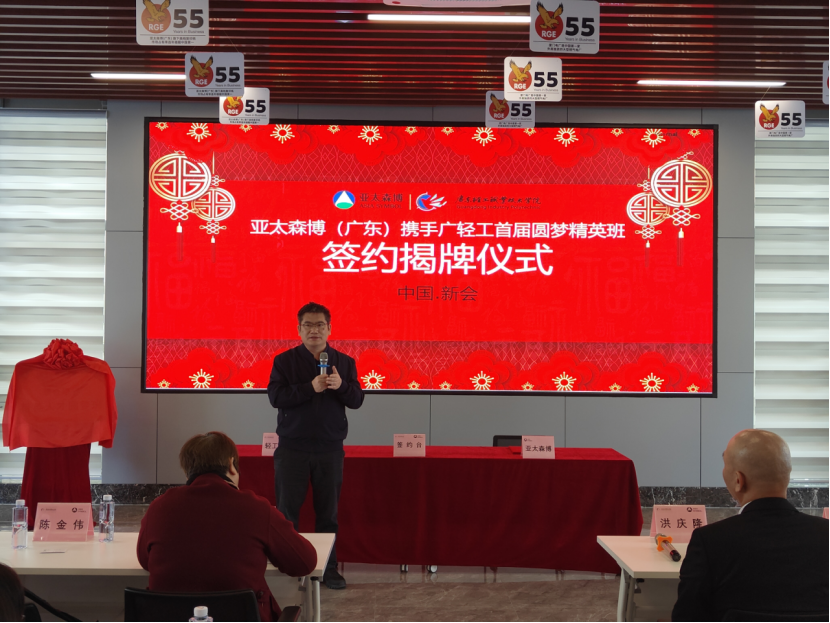 亚太森博董事总经理洪庆隆发表了讲话,感谢广东轻工对圆梦班的重视并介绍了公司的业务和实力,表示公司将不断深化校企合作,实现共创、共享、共赢的目标,将为圆梦班学生提供广阔的发展平台,希望同学们能够好好努力,将专业知识与实践相结合,力求成为公司的优秀人才。
