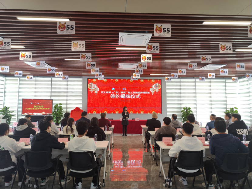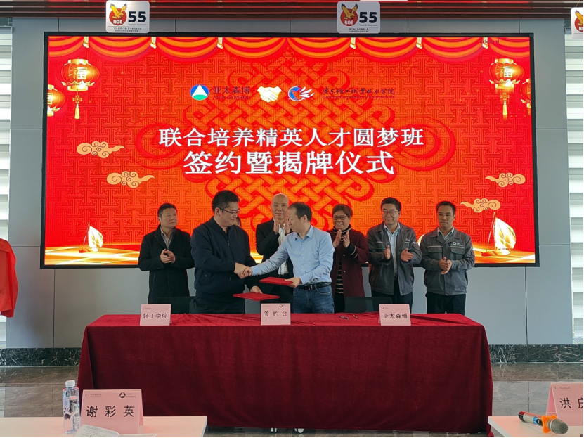 陈金伟、马洪江分别代表学校和企业签订了《亚太森博圆梦精英班培养协议书》。随后,谢彩英与洪庆隆为圆梦班进行了揭牌,“亚太-广轻联合培养精英人才圆梦班”正式成立。