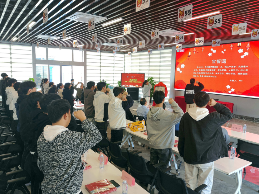 学生代表李文斌、林佳瑶领誓,同学们表示愿遵守公司、学校各项规章制度、服从管理、认真学习、尽力做好公司及老师交办的任务,诚实守信、履行诺言,凝聚全班向心力、争取全班荣誉为己任。