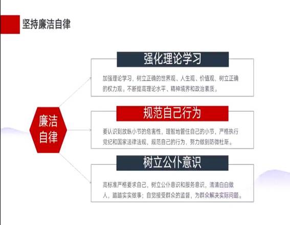 坚持廉洁自律,加强理论学习,树立正确的世界观、人生观、价值观,树立正确的权力观。不断提高理论水平、精神境界和政治素质。规范自己行为,要认识到“小节放纵,大节必失”,理智地管住自己的小节,严格执行党纪和国家法律法规,规范自己的行为,努力做到防微杜渐。树立公仆意识,高标准严格要求自己,清清白白做人,踏踏实实做事;自觉接受群众的监督,为群众解决实际问题。