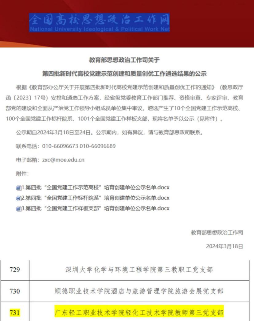 近日,教育部思政司公布了《教育部思想政治工作司关于第四批新时代高校党建示范创建和质量创优工作遴选结果的公示》,轻化工技术学院教师第三党支部在学校党委的正确领导下成功入选“全国党建工作样板支部”。