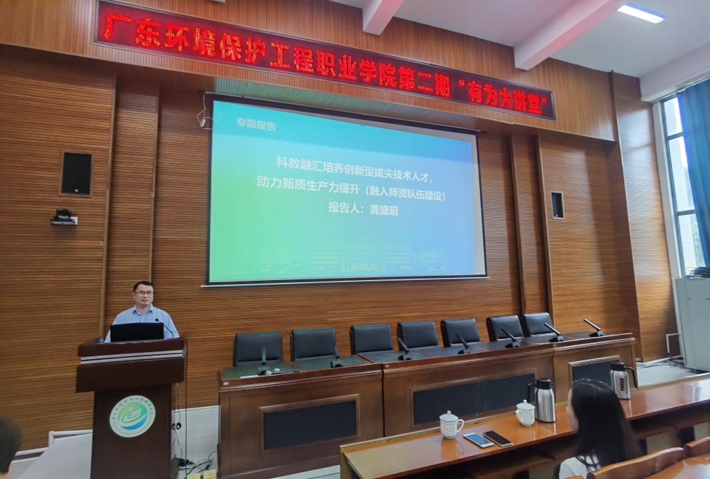 2024年4月18日,龚盛昭名教师工作室主持人龚盛昭教授到广东环境保护工程职业学院做了题为《科教融汇培养创新型拔尖技术人才,助力新质生产力提升》的讲座,得到该校领导和老师们的高度赞赏,纷纷表示要借鉴与应用该成果做法。