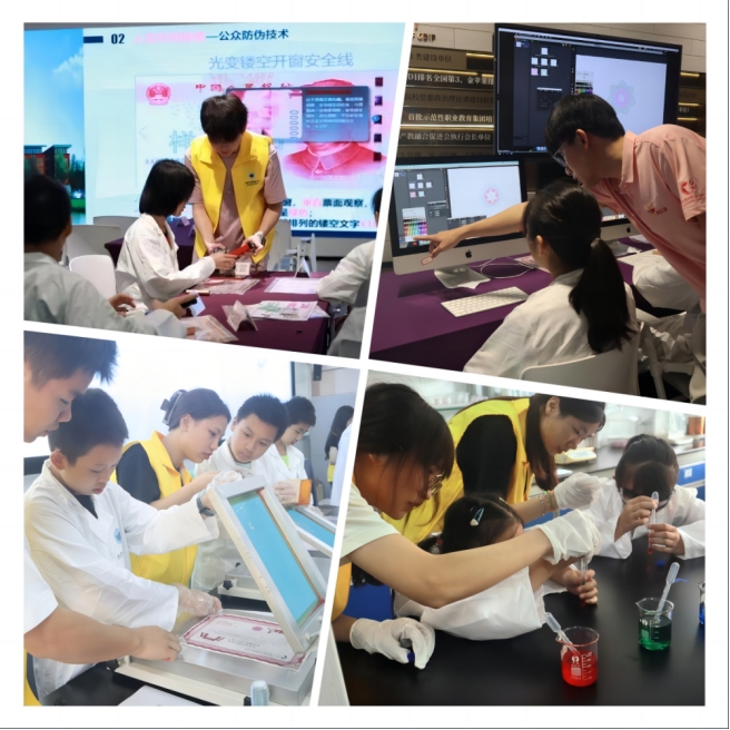 进入活动B区“生活中的防伪技术”板块,被分组到此的孩子们正在老师的指导下认识那些被应用在日常生活中的防伪技术:产品包装上的浮雕文字、底纹和团花等。孩子们举起放大镜,把样品放在紫外灯下端详,好像寻找宝藏一般,一发现那些独特的防伪标识,立马高兴地和身旁的同伴分享所见。此外,孩子们还在老师的教导下,体验了丝网印刷技术,并亲手将广东轻工职业技术学院的校徽图案“小鸽子”印制在自己的研学证书上。