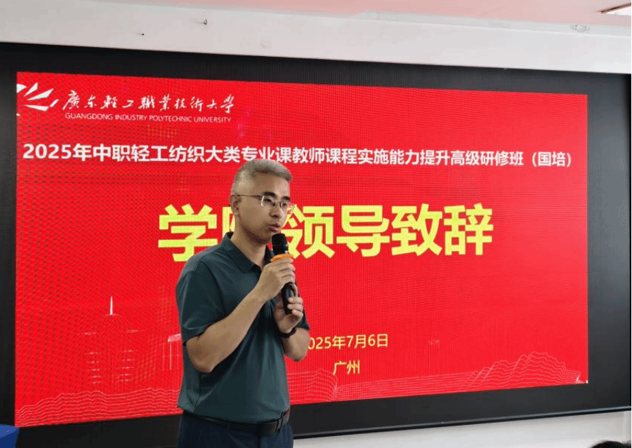 开班仪式上,郭涛副院长首先致辞。他强调,作为国家示范性高等职业院校和“双高计划”建设单位,广东轻工职业技术大学拥有卓越的师资队伍与丰富的培训积淀,该项目团队为本次研修班量身定制了系统化的课程体系。研修班以“产业专业融合、课程教材建设、教育教学改革”为主线,深度聚焦教师课程实施能力的精进。培训内容丰富多元,涵盖职业教育政策深度解读、教学模式创新实践、课程设计与评价优化、企业实践等多维度知识模块。培训形式亦灵活多样,结合了集中面授、互动研讨、企业实地调研等环节。郭涛副院长热切期望学员们能在此期间积极互动,互学互鉴,共同成长,力求将所学知识与技能内化于心、外化于行,转化为推动职业教育发展的强大动力,为个人的职业进阶与长远发展奠定坚实基础。