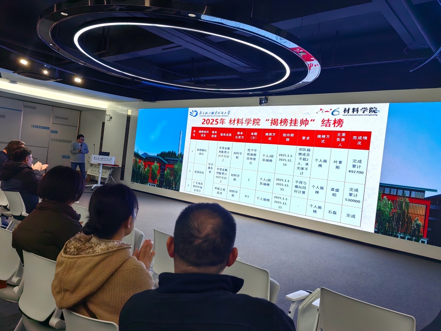 大会公布了2025年度学院“揭榜挂帅”项目结榜成果。叶素娟老师牵头的横向项目到账49.27万元,龚盛昭老师负责的成果转化项目到账53万元,石磊老师成功申报广东省自然科学基金项目,三大榜单均圆满完成,彰显了学院有组织科研的显著成效。