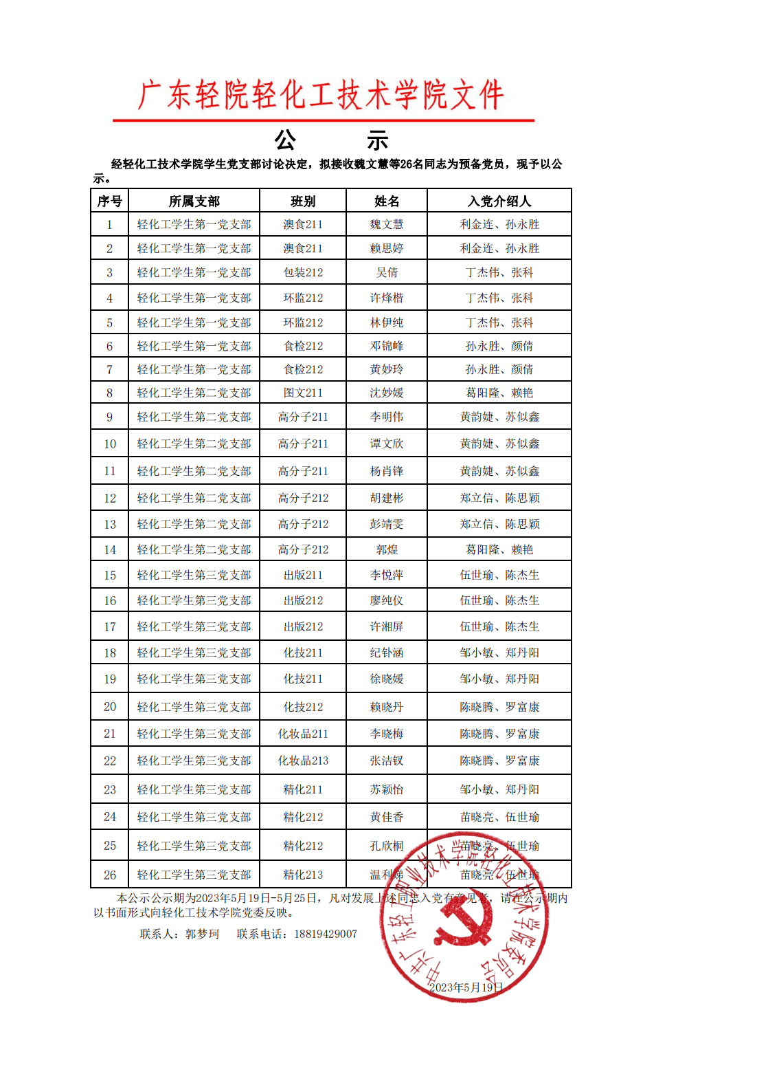 轻化工技术学院2023年上半年拟发展预备党员公示