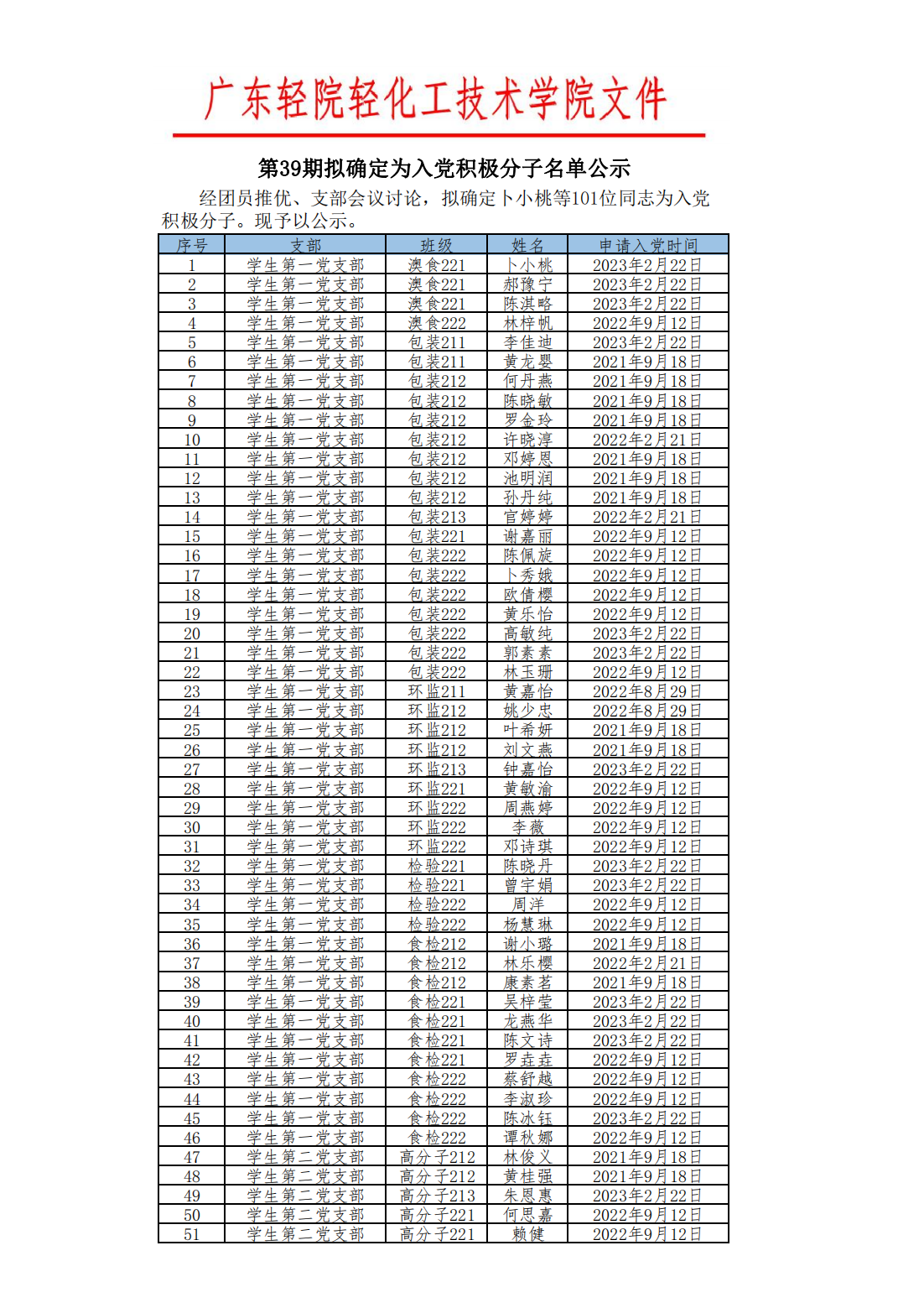 轻化工技术学院第39期拟确定为入党积极分子名单公示