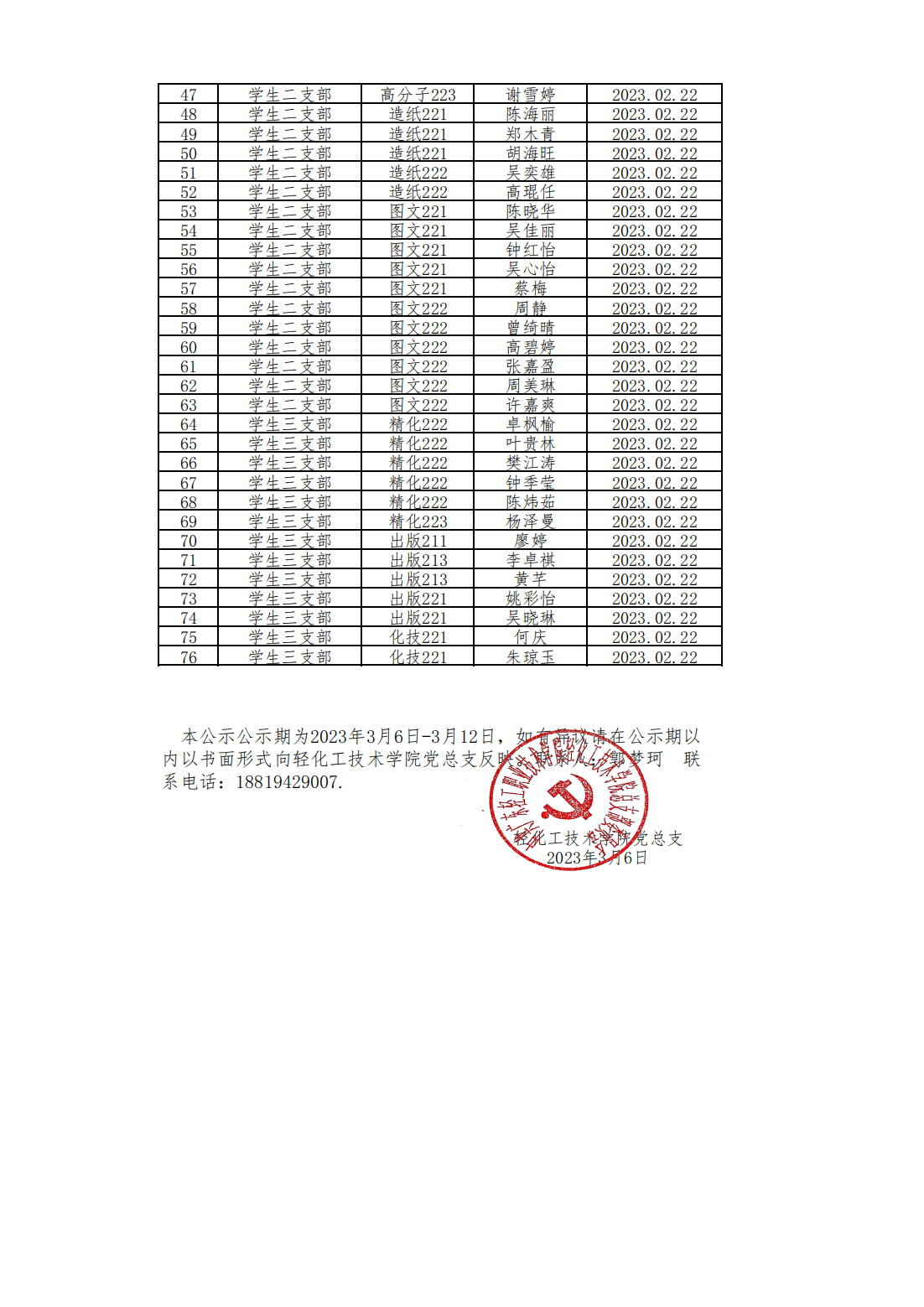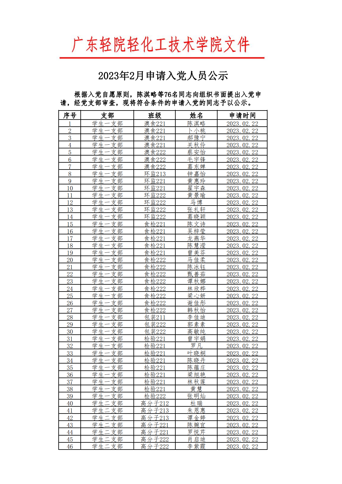 轻化工技术学院2023年2月申请入党人员公示