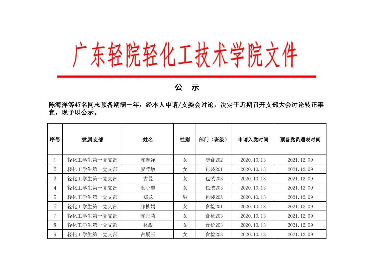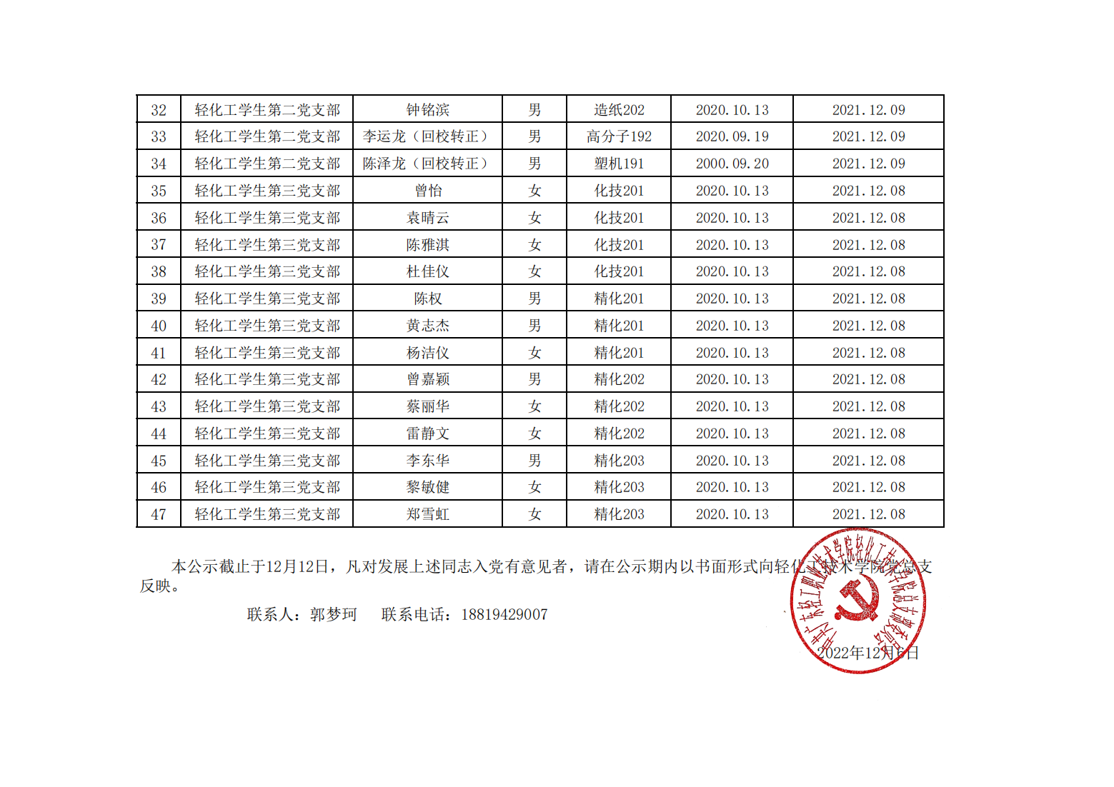 2022年下半年轻化工技术学院拟发展预备党员公示
