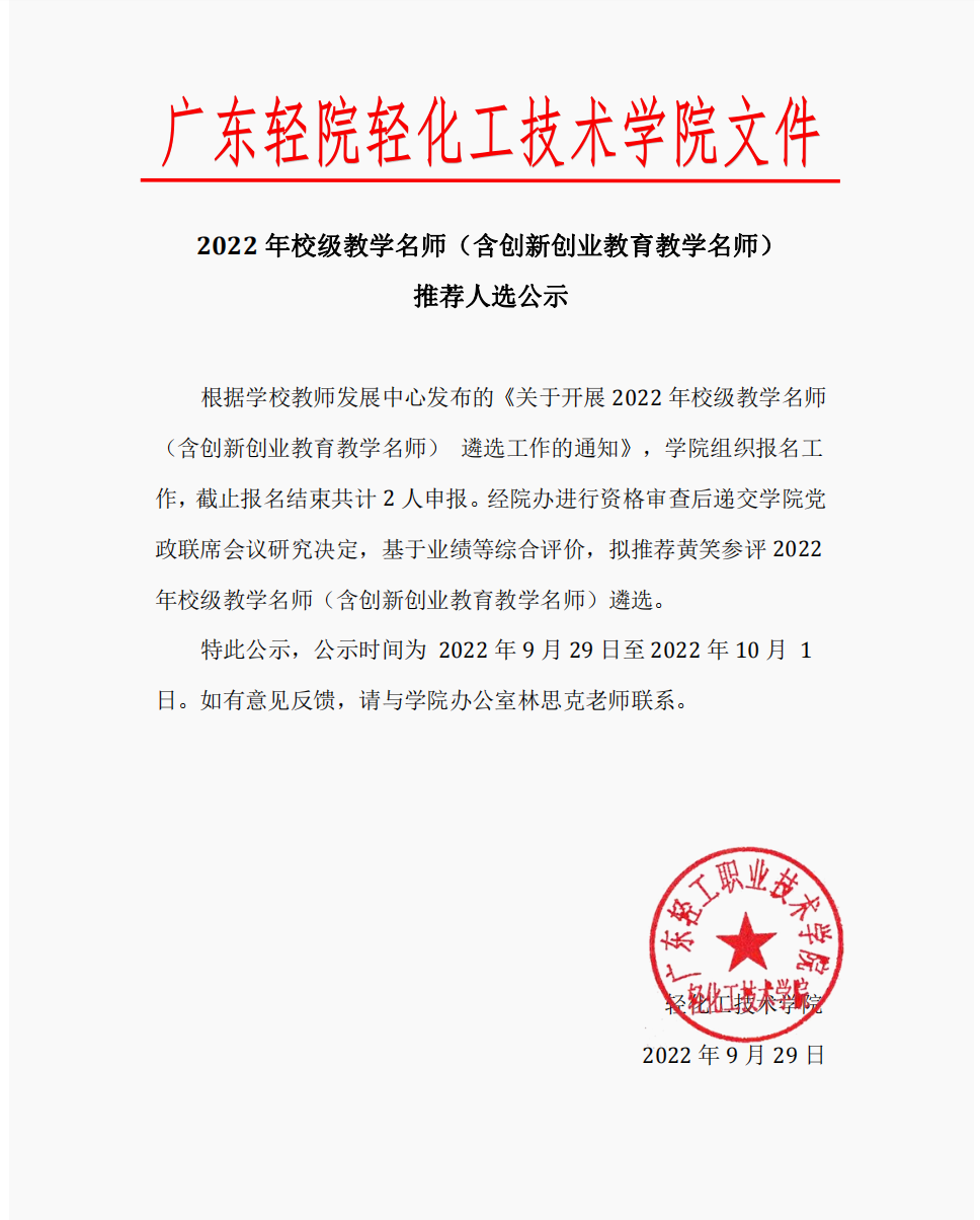 2022年校级教学名师(含创新创业教育教学名师)推荐人选公示