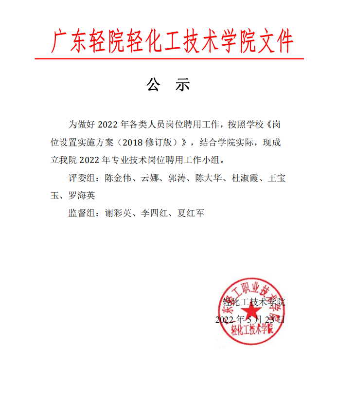 轻化工技术学院2022年专业技术岗位聘用工作小组