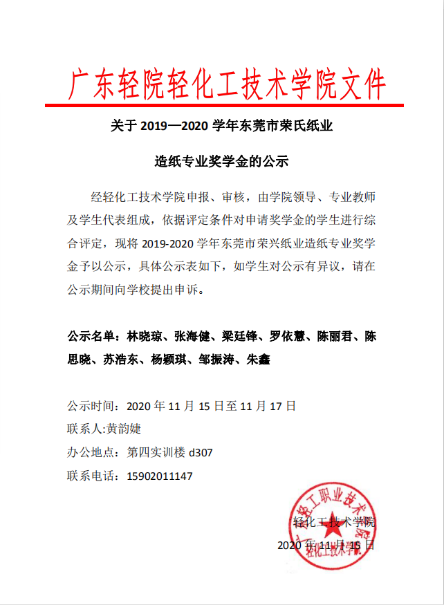 关于2019—2020学年东莞市荣氏纸业造纸专业奖学金的公示