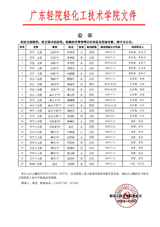 轻化工技术学院发展对象公示