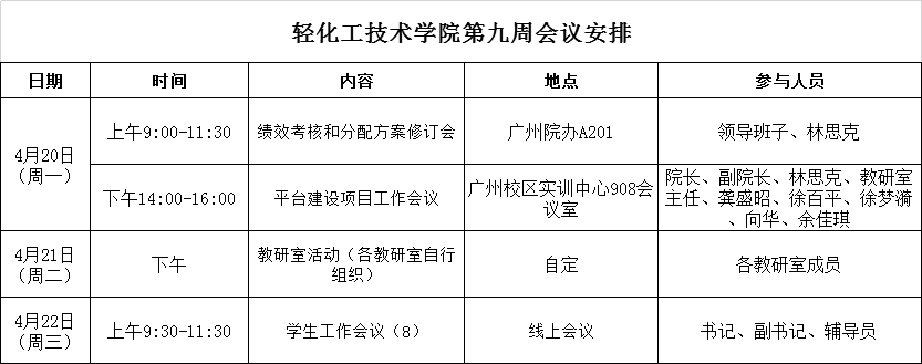 轻化工技术学院第九周会议安排