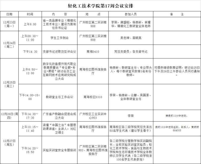 轻化工技术学院第17周会议安排