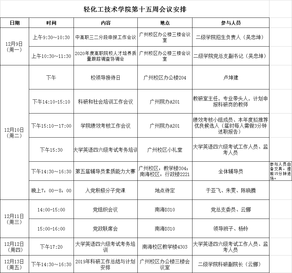 轻化工技术学院第十五周会议安排