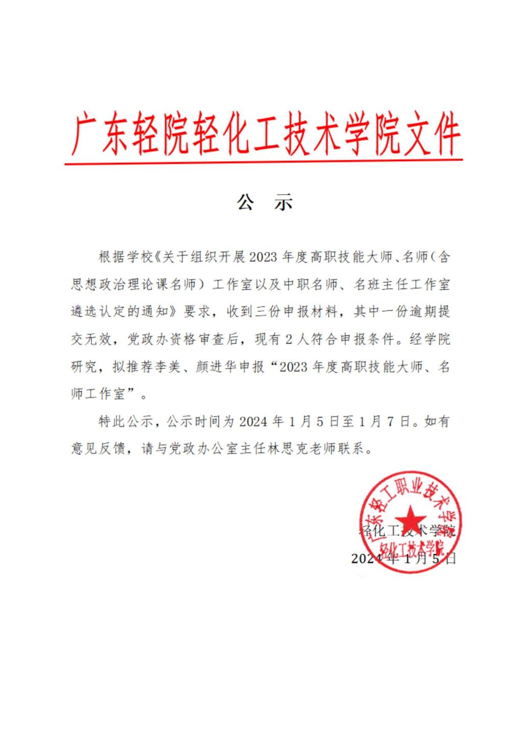 关于2023年度高职技能大师、名师工作室的公示