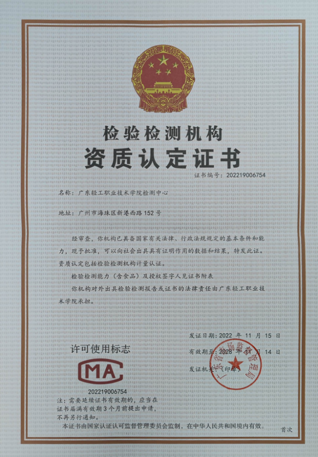 11月22日,广东轻工职业技术学院检测中心(以下简称广轻检测中心)收到了广东省市场监督管理局寄来的《检验检测机构资质认定证书》。此证书标志着广轻检测中心已顺利通过CMA资质认定,已具备国家有关法律、行政法规规定的基本条件和能力,可以向社会出具具有证明作用的数据和结果,资质认定包括食品检测、商品检测及环境监测等五十多项。