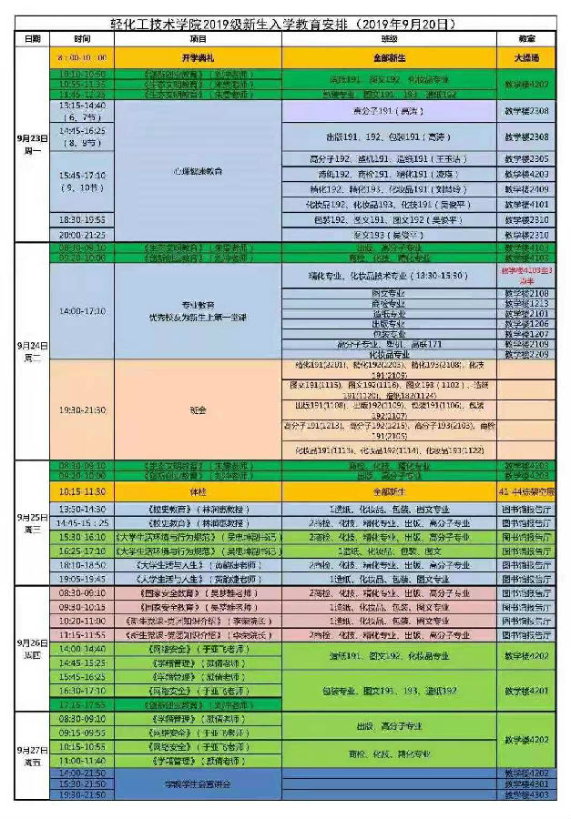 轻化工技术学院2019级新生入学教育安排表: