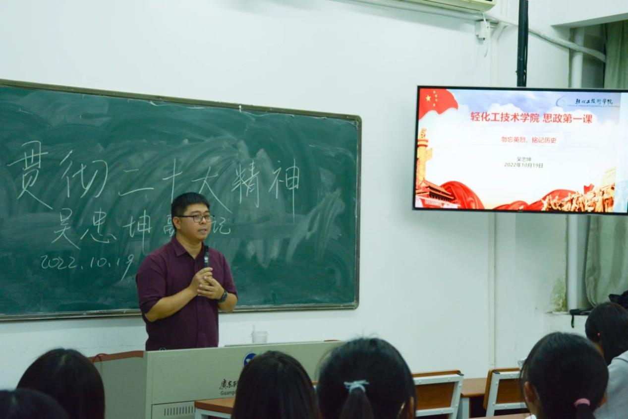 广东轻化工技术学院于2022年10月19日在南区二号楼514教室召开了一场思政第一课,旨在加强青年大学生的思想建设,鼓励轻工学子为民族复兴、国家富强贡献力量,呼吁学生爱党、爱国、爱家。