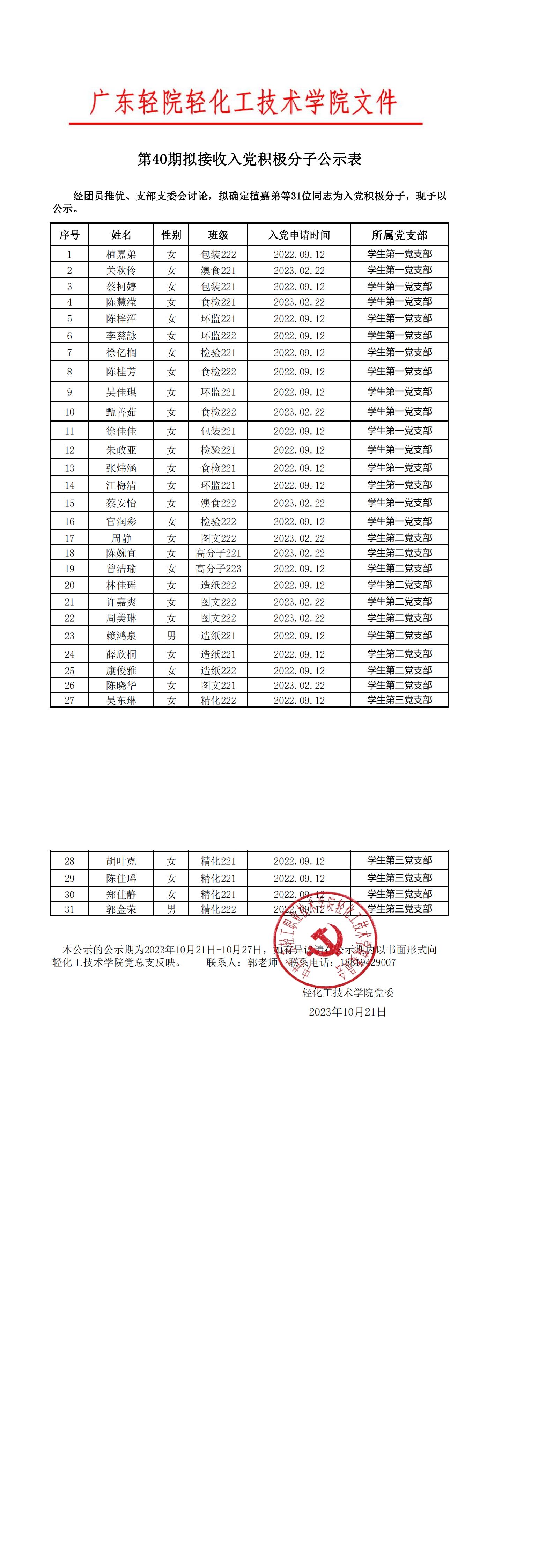 轻化工技术学院第40期拟接收入党积极分子公示