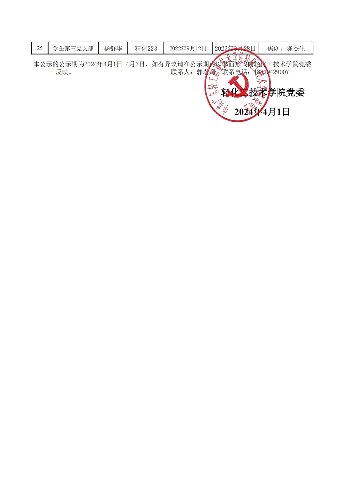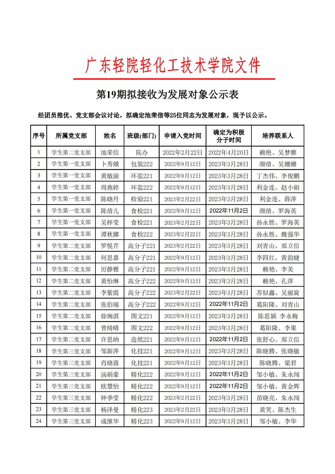 轻化工技术学院第19期拟接收为发展对象公示
