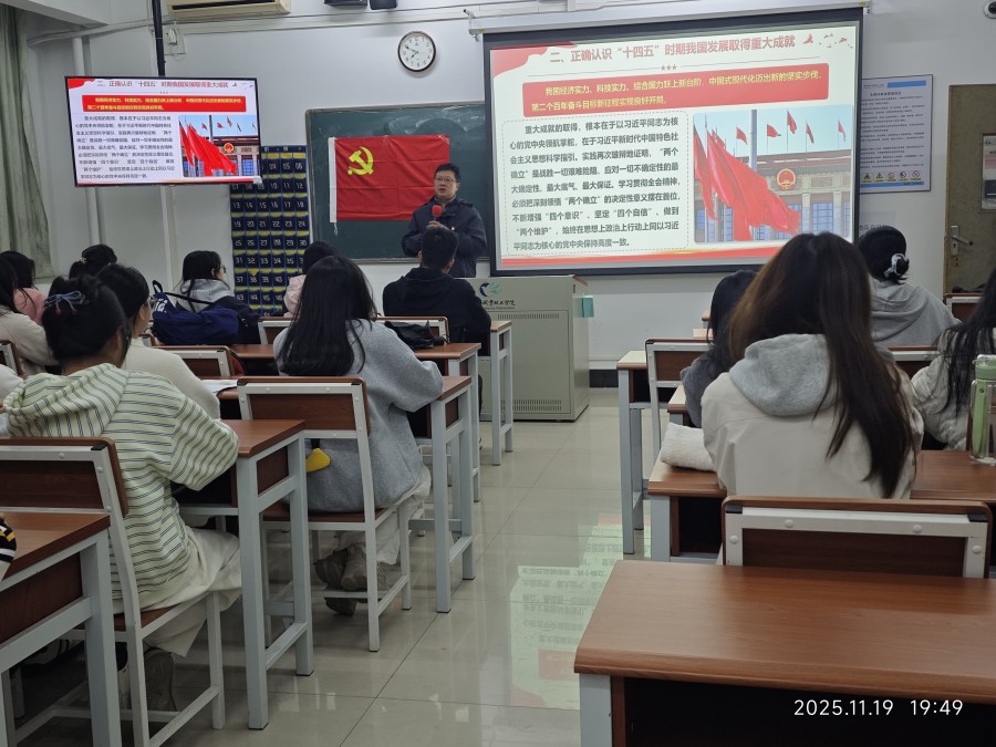 谢书记从了解掌握全会基本情况及重大成果、正确认识“十四五”时期我国发展取得重大成就、深刻领会党中央关于国内外形势的基本判断、准确把握“十五五”时期经济社会发展的指导思想、重大原则、主要目标、战略任务和重大举措、根本保证、大学生如何贯彻落实党的二十届四中全会精神五个方面讲解党的二十届四中全会精神。