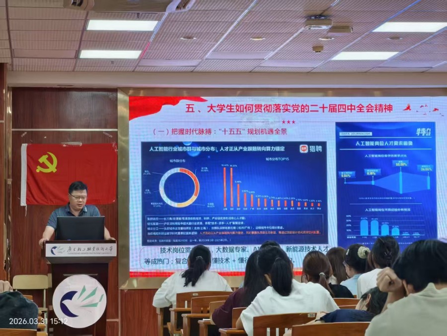 本次课程以学习贯彻党的二十届四中全会精神为核心,系统讲解全会基本情况、“十四五”重大成就、发展形势判断、“十五五”规划部署及大学生实践路径,聚焦《中共中央关于制定国民经济和社会发展第十五个五年规划的建议》核心框架,结合材料学科特点,重点解读科技自立自强、绿色发展、现代化产业体系等内容,精准适配大一专科生认知水平。